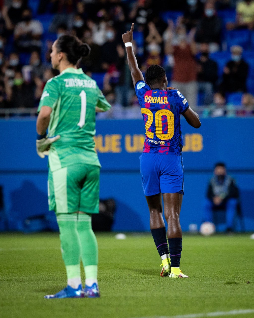 Oshoala played for Arsenal from March 2016 to February 2017, helping them to win the FA Cup, and did not celebrate her goal at the Johan Cruyff Stadium.