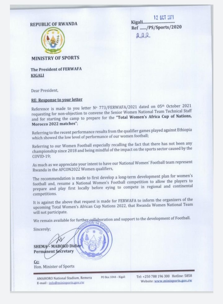 It is against the above that the request is made for FERWAFA to inform organizers of the upcoming Total Women’s African Cup of Nations 2022 that Rwanda Women National Team will not participate.” The lengthily interwoven letter partly read as the State called for the improvement of the women’s game in the country.