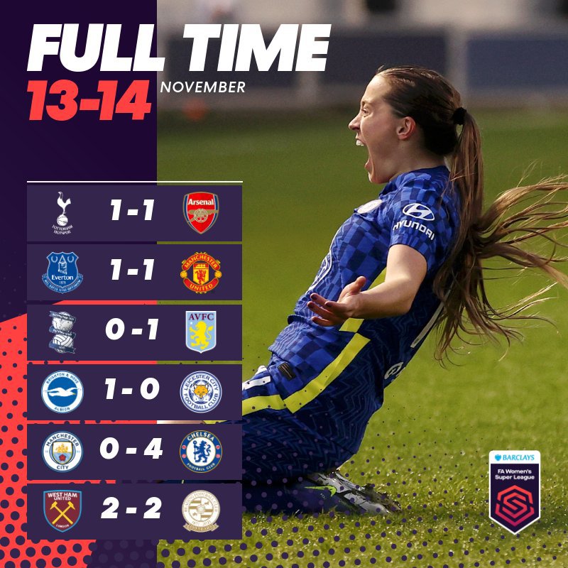 Fifth-placed Manchester United were forced to a 1-1 draw by Everton FC. Ella Toone completed a breath-taking counter attack to give the Reds the lead after 10 minutes, but a second-half equaliser from Simone Magill saw the spoils shared.