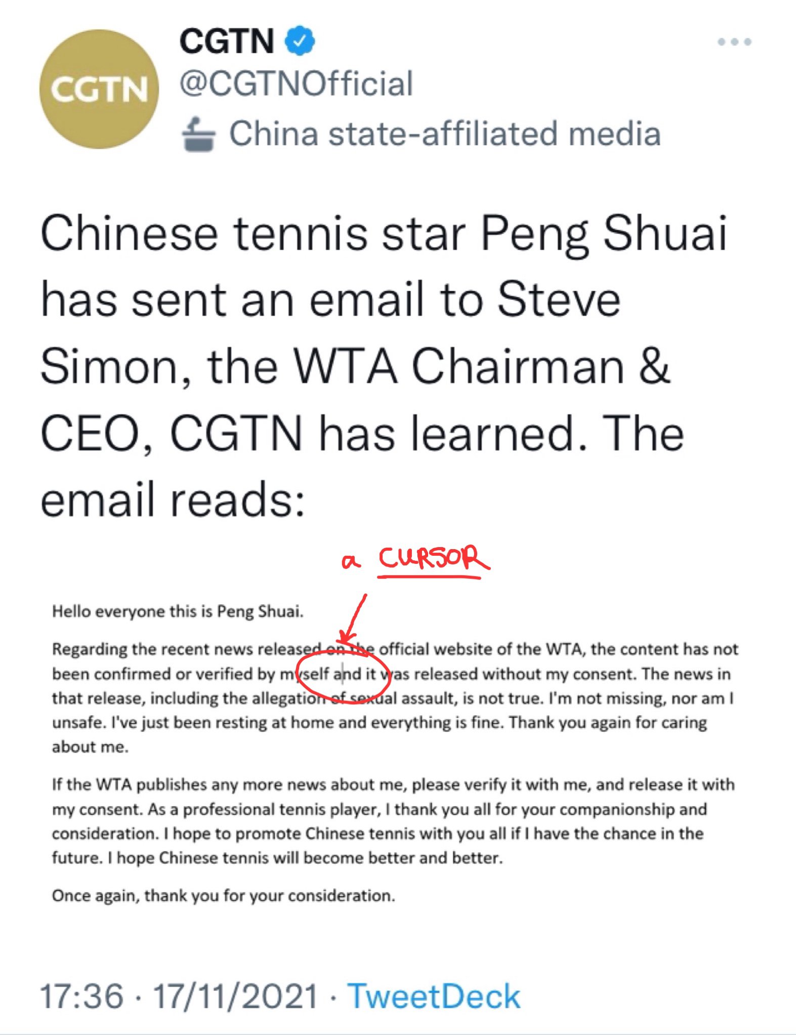 After so much pressure and questions by the general public, on November 17, Chinese state media published a letter purportedly from Peng, claiming that she is safe, resting at home and that the allegations of sexual assault are not true. The observant public noticed a flaw in the supposed letter as a cursor was seen in between the write up which suggested it was an edited, fake letter.