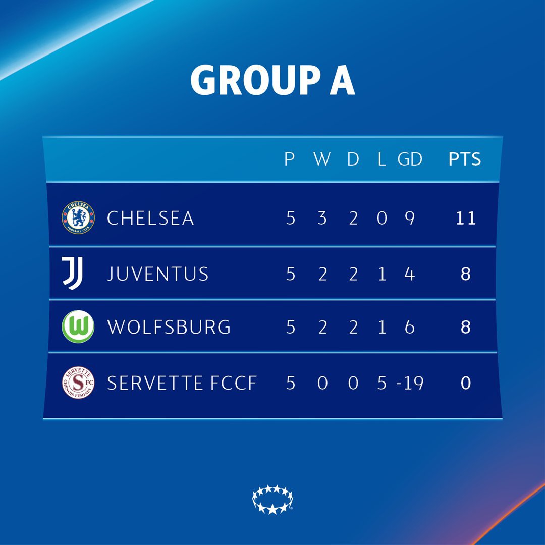 With Wolfsburg winning against Servette, they are now level with Juventus in second place on eight points while Chelsea are three points clear, but still have work to do to reach the knockout phase of the Champions League with a trip to Germany to come on matchday six.