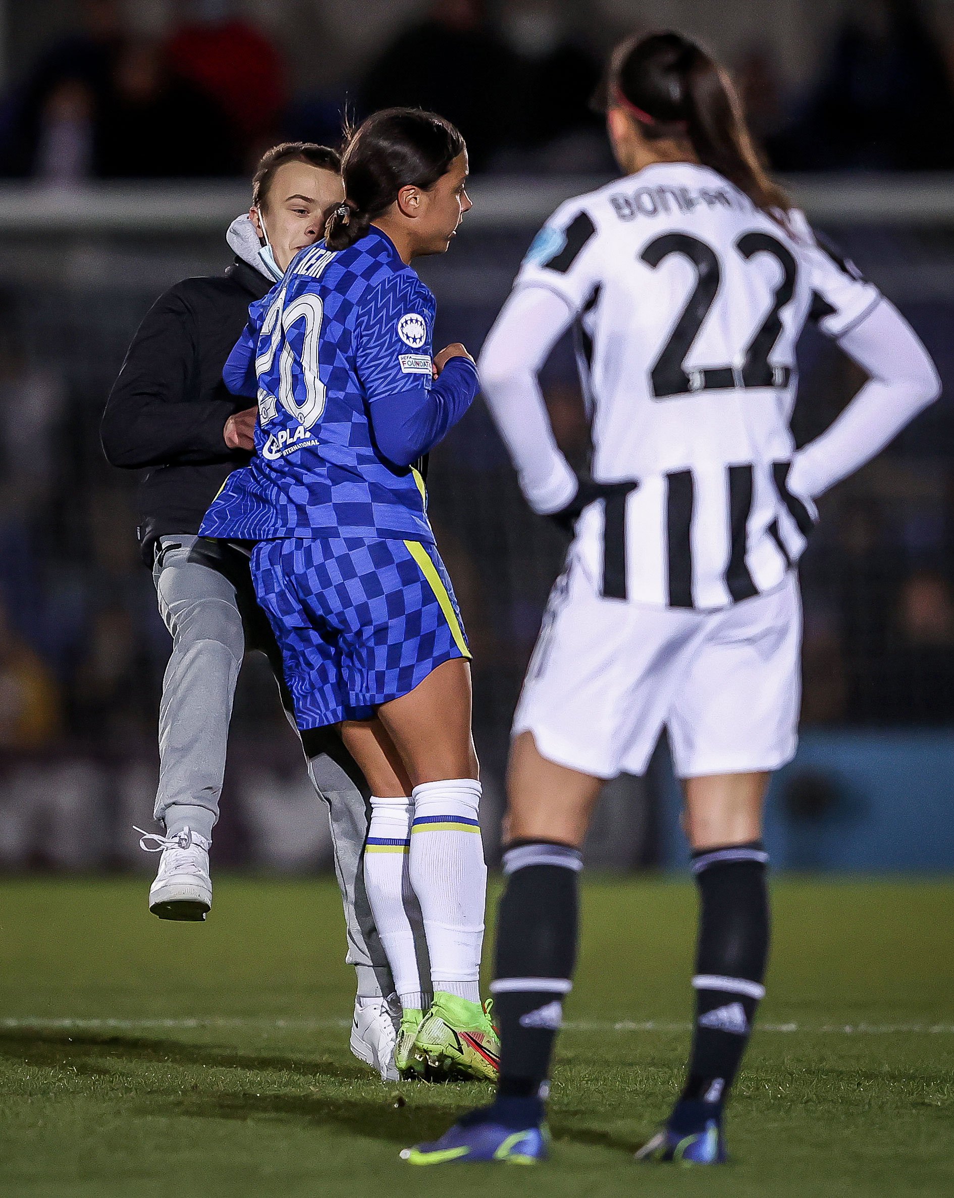 Sam Kerr got a yellow card for knocking to the ground a pitch invader ran onto the field.