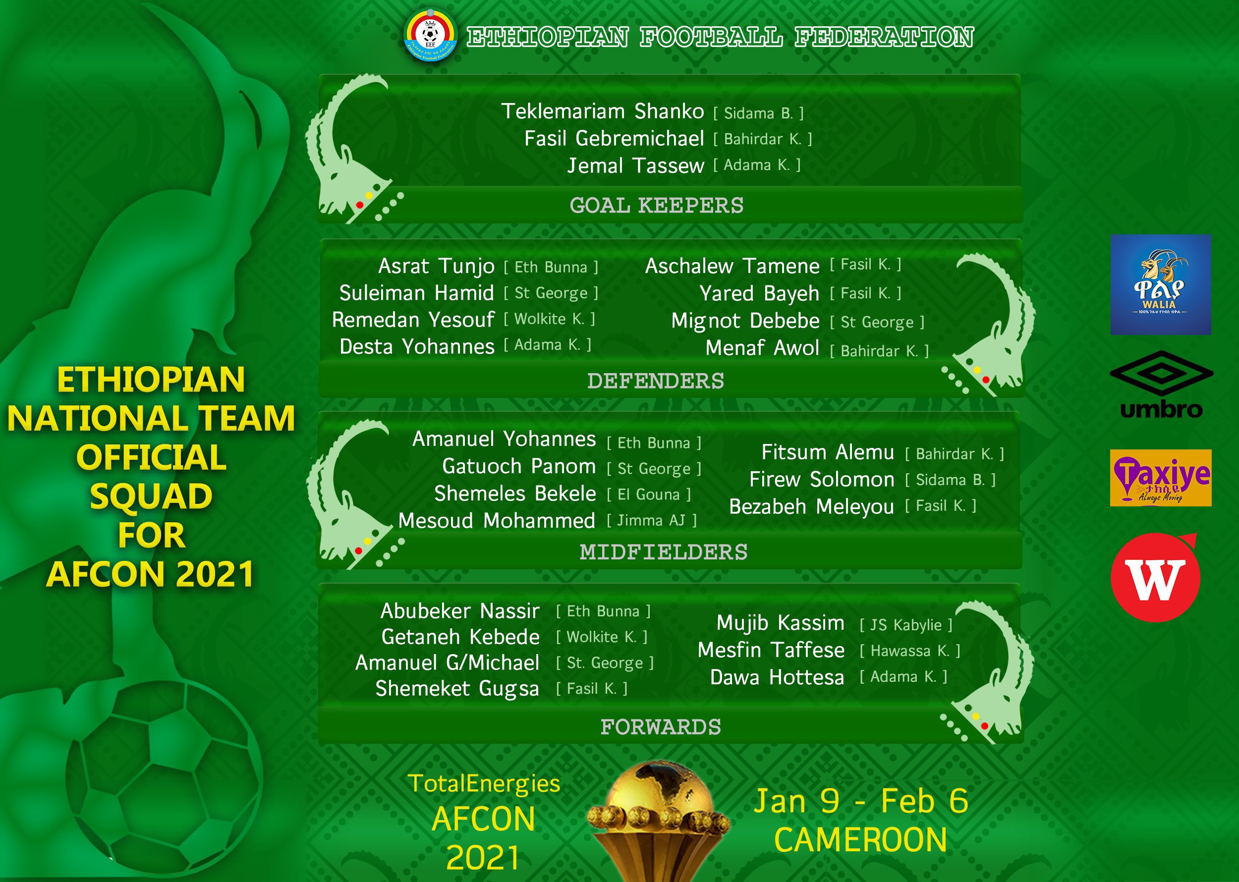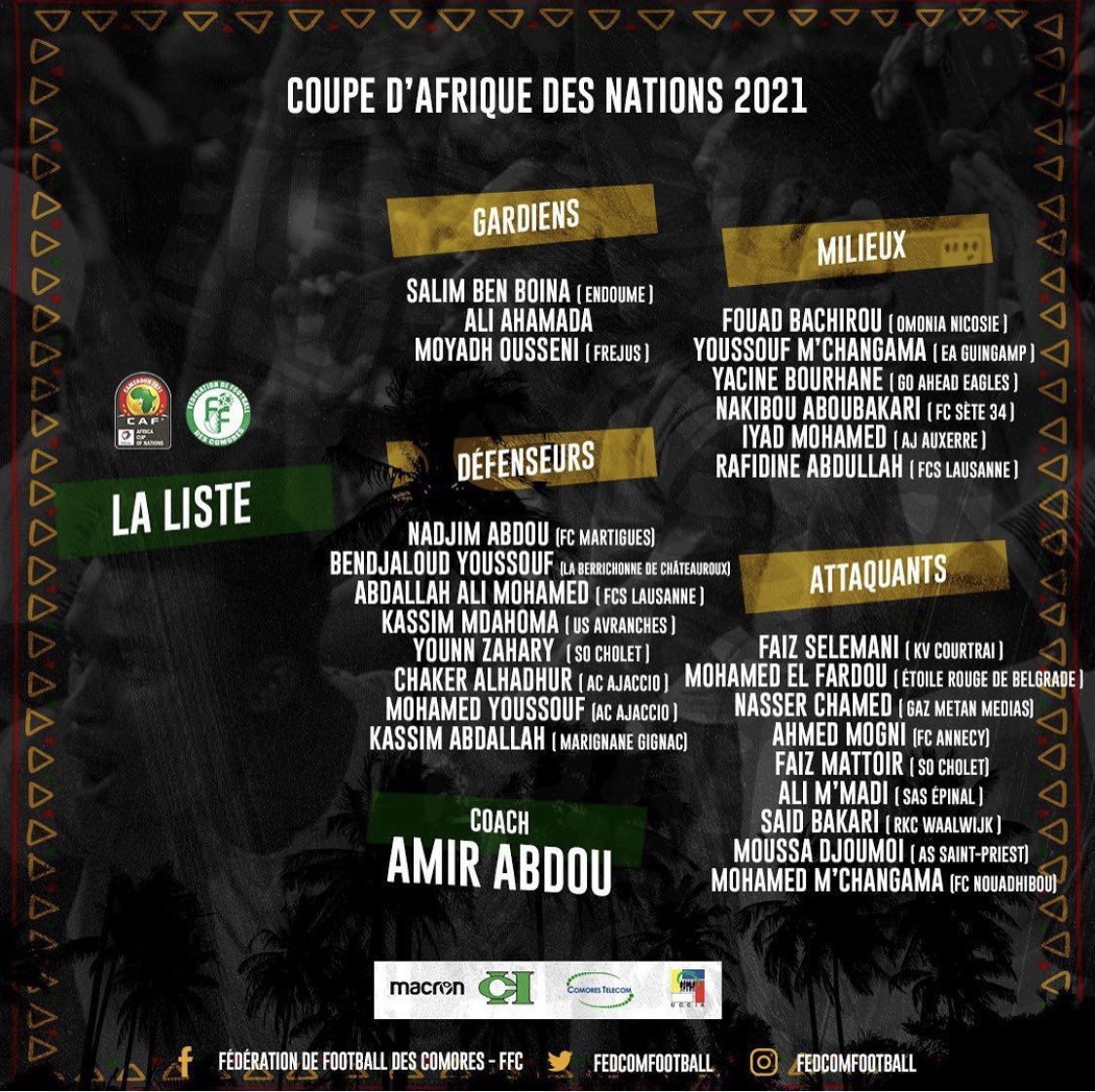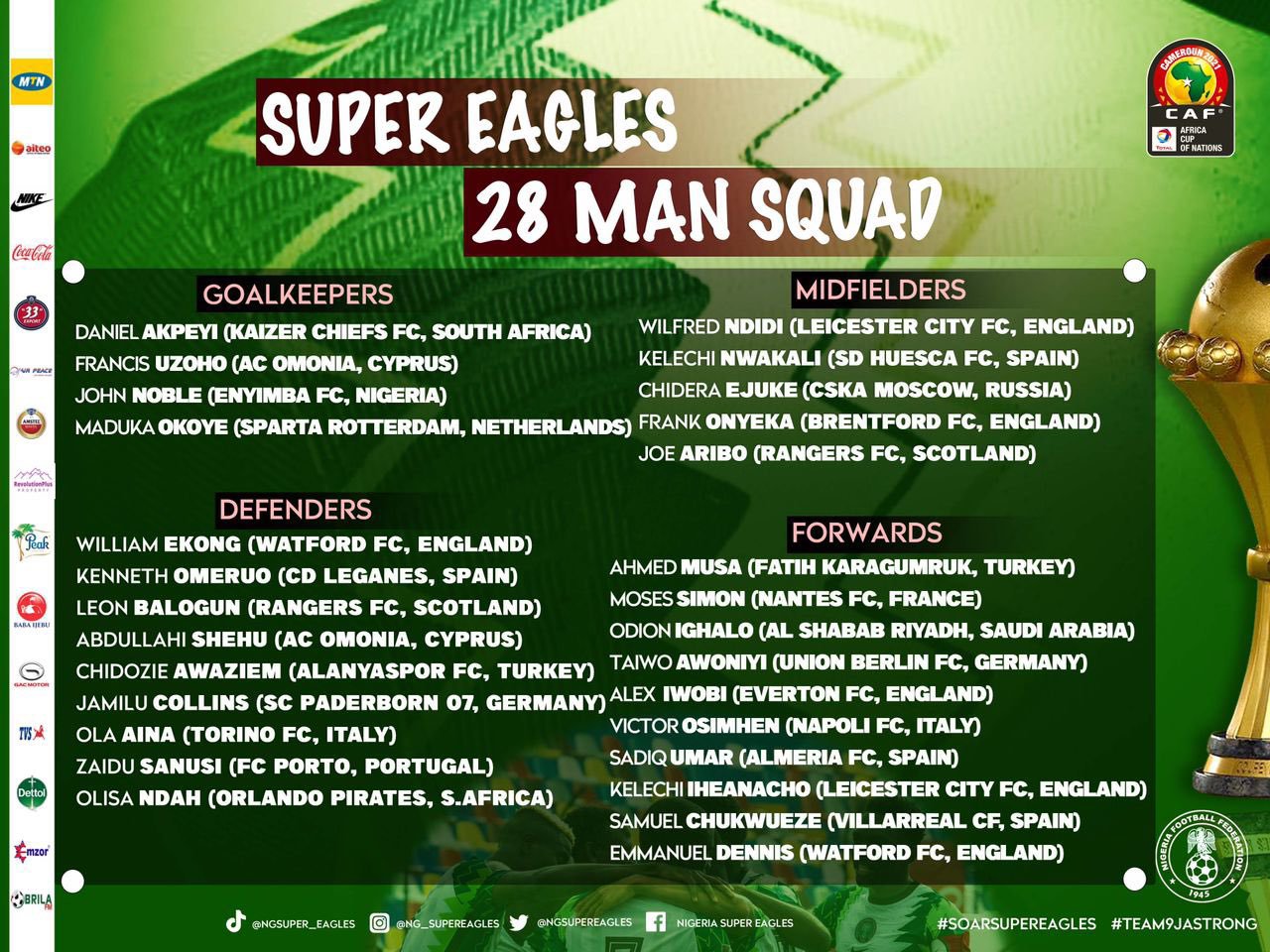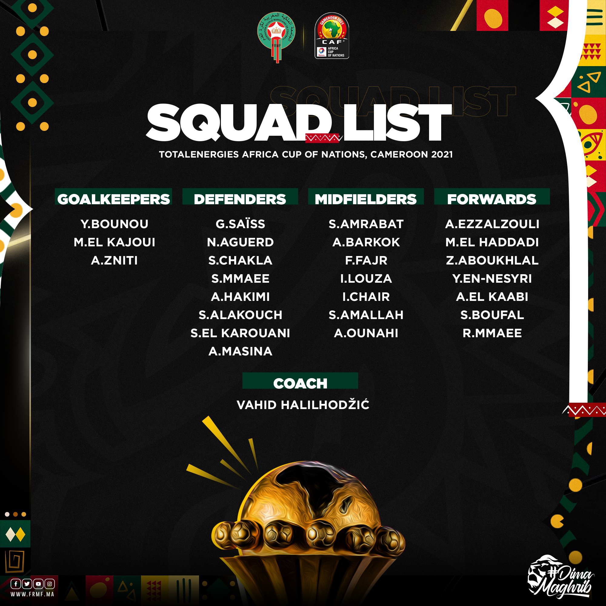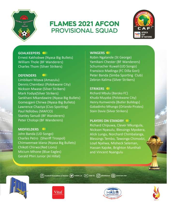 The nations that have confirmed squads are champions Algeria, 2019 runners up Senegal, hosts Cameroon, Ethiopia, Nigeria, Gambia, Cape Verde, Comoros, Guinea, Ivory Coast, Malawi and Morocco.