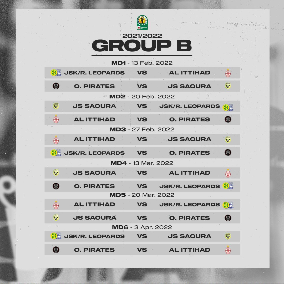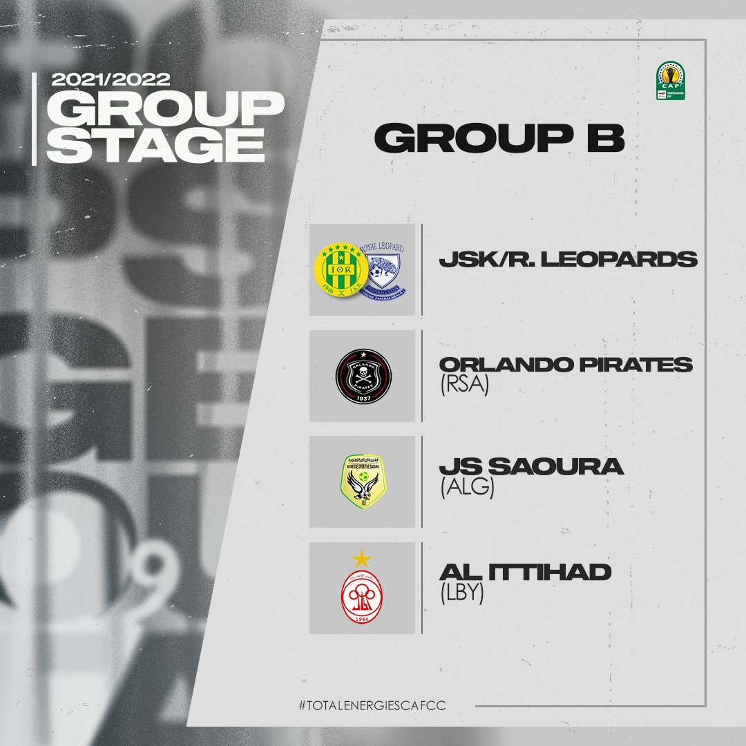 In Group B, Orlando Pirates will battle it out with JS Soura, Al Ittihad and either of JS Kabylie or Royal Leopards whose match is yet to be decided by CAF.