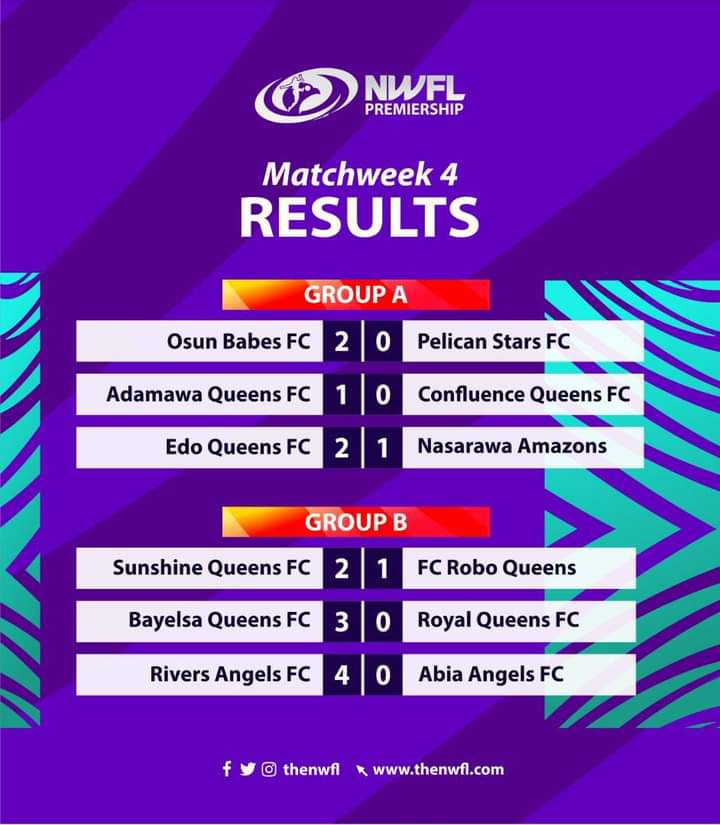 Week four witnessed sixteen (16) goals scored altogether, fourteen (14) by home teams and two (2) by away teams. Osun Babes, Adamawa Queens & Sunshine Queens all recorded their first win of the season, as all home teams win their respective match.