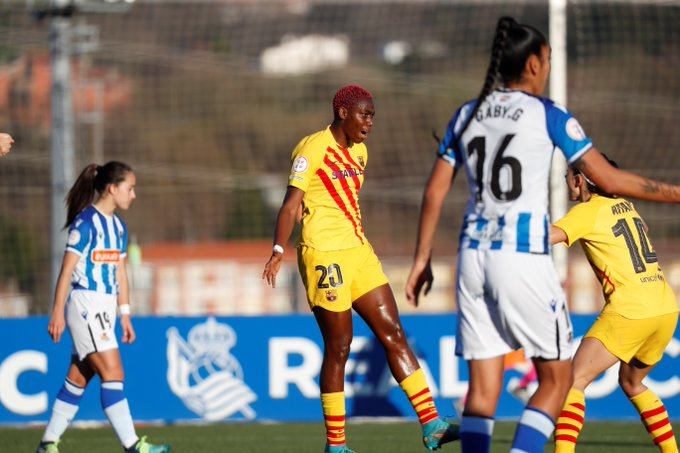 Super Falcons captain Asisat Oshoala scored twice on her 100th Barcelona appearance as the team led by Jonatan Giráldez thrashed Real Sociedad 1-9 on Wednesday, at the Instalaciones de Zubieta Stadium.