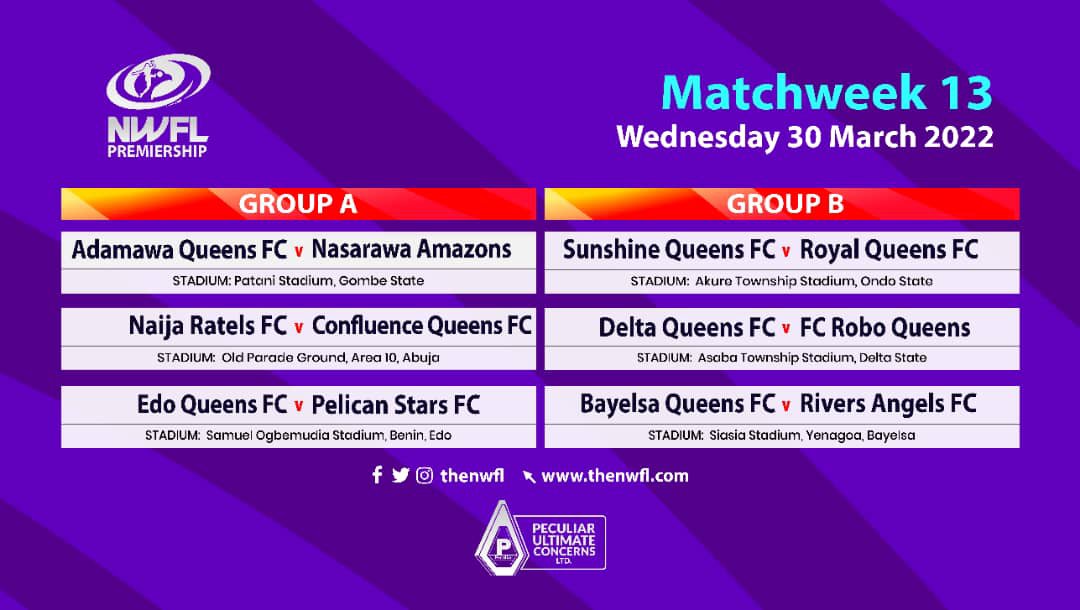 Sunshine Queens who are in a very difficult situation, will face the Canadian Geese’ in Akure, FC Robo Queens travels to Asaba to face Delta Queens in a must win game for the two sides. Bayelsa Queens welcomes Abia Angels to the Samson Siasia Stadium, Yenagoa, while Edo Queens and Pelican Stars will battle at the Samuel Ogbemudia Stadium, Benin.